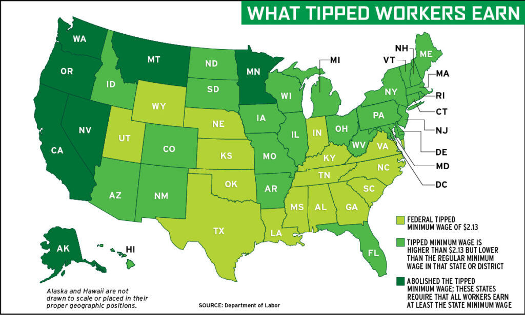 Some states—such as Alaska and Nevada—require employers to pay close to or the full state minimum wage before tips.