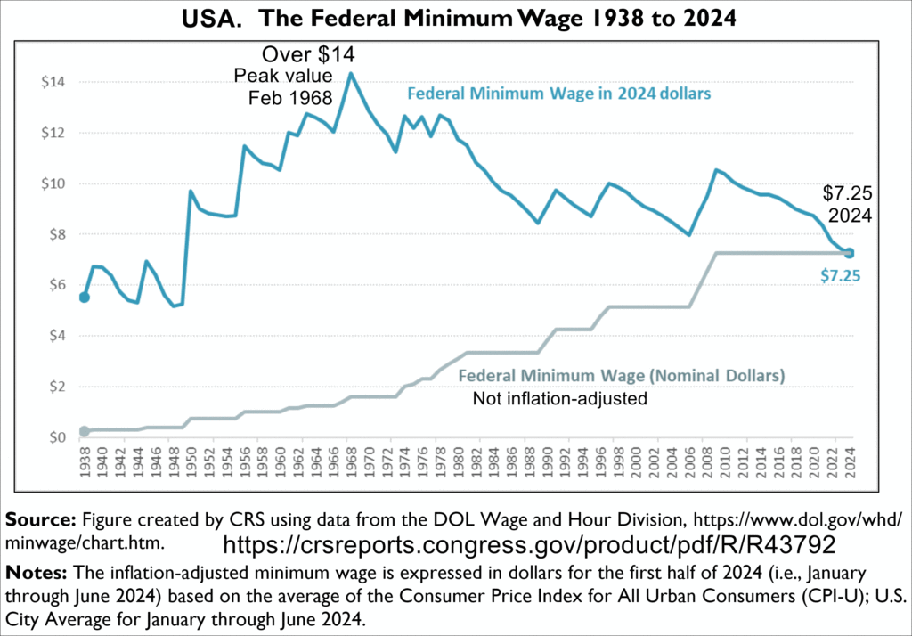 The federal minimum wage in the United States is $7.25 per hour, last updated in July 2009. This rate applies to workers covered by the Fair Labor Standards Act (FLSA). However, states and local governments can set higher minimum wages. When state or local rates are higher than the federal rate, the higher wage prevails. Not all workers are subject to federal minimum wage laws, including some tipped employees and specific industries.