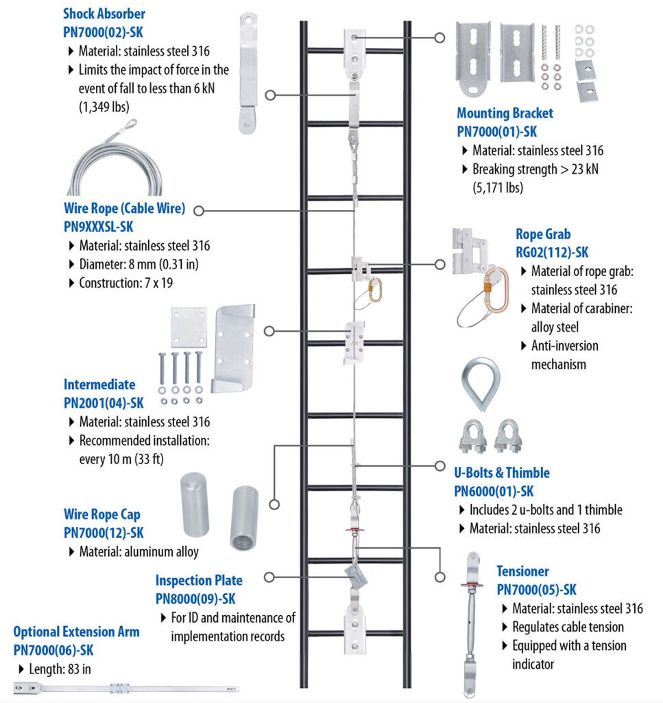 - When a fixed ladder extends more than 24 feet above a lower level, OSHA mandates the use of a ladder safety system or a personal fall arrest system. These systems typically include a fixed cable, carabiner, full-body harness, and self-retracting lanyard or rope grab. The purpose is to prevent serious injury in the event of a slip or loss of balance, which is especially critical on ships where footing may be compromised due to ship motion or wet surfaces.